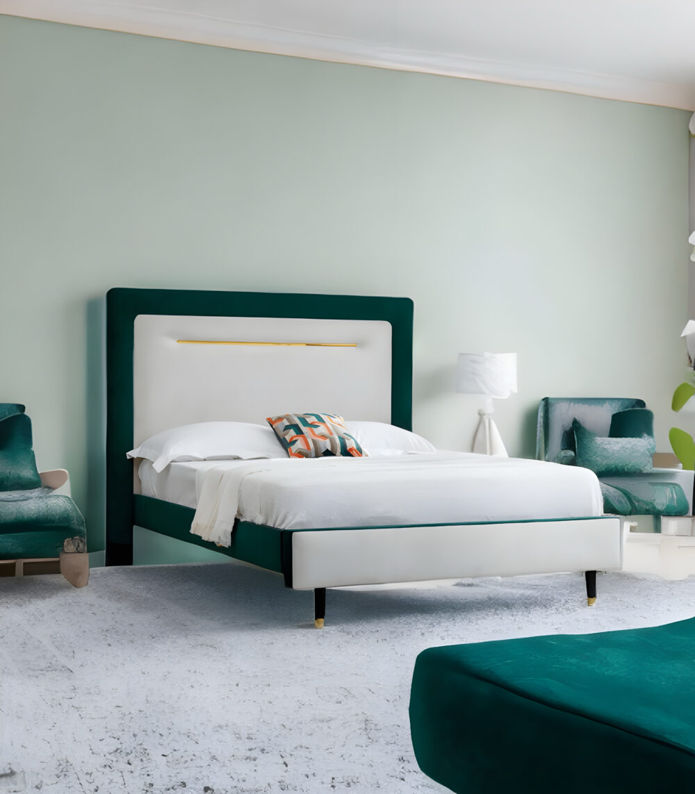 Introduce a touch of modern luxury to your bedroom with the Green-Cream Upholstered Bed, a beautifully designed masterpiece that combines plush comfort with refined glamour. With its stunning two-tone colour scheme, gold accents, and premium upholstery, this bed becomes the focal point of any contemporary bedroom.